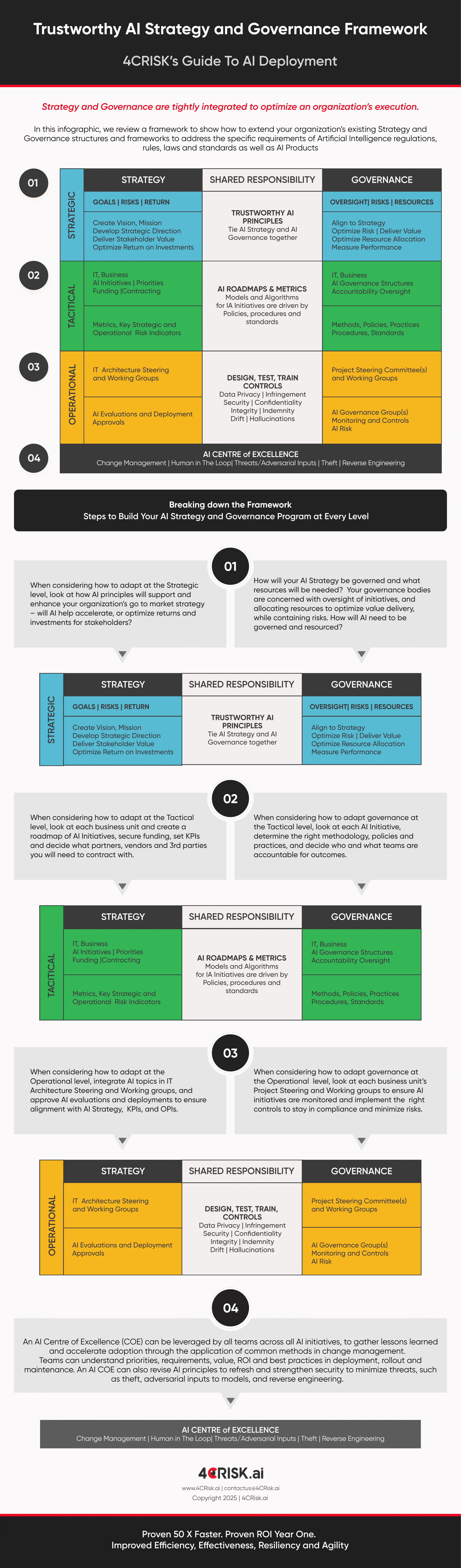 In this infographic, we review a framework to show how to extend your organization’s existing Strategy and Governance structures and frameworks to address the specific requirements of Artificial Intelligence regulations, rules, laws and standards as well as AI Products.